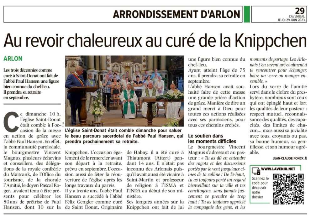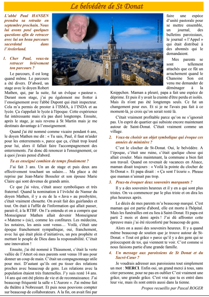 Il y a trente ans cette année, l’abbé Paul Hansen a succédé à l’Abbé Félix Gengler comme curé de St Donat. L’Abbé Paul Hansen venait de Thiaumont. Celui-ci n’était pas inconnu des arlonais puisqu’il avait été vicaire à St-Martin et professeur à l’ISMA au début de son ministère. Ses longues années sur la Knippchen ont fait de lui une figure bien connue de notre ville. Ayant atteint l’âge de75 ans, il accède à une retraite. En outre, en 2023, il célèbre ses 50 ans de prêtrise.