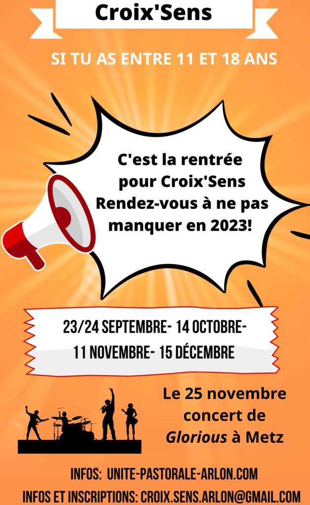 Le groupe Croix’sens propose aux jeunes (et moins de jeunes) de vivre le concert du groupe de rock-pop-louange-chrétien « Glorious » qui se produira à l’église Sainte Thérèse, Metz le 25 novembre prochain de 20h00 à 22h00, prix ≈ 20€ .