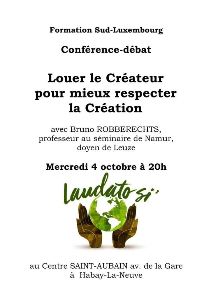 Dans le cadre de notre mois consacré à soigner notre maison commune, la « Formation Sud-Luxembourg » nous a invité à une grande soirée de CONFÉRENCE-DÉBAT : « Louer le Créateur pour mieux respecter la Création ». C’est le professeur au séminaire de Namur et doyen de Leuze, Mr l’abbé Bruno Robberechts, qui a présidé cette conférence.