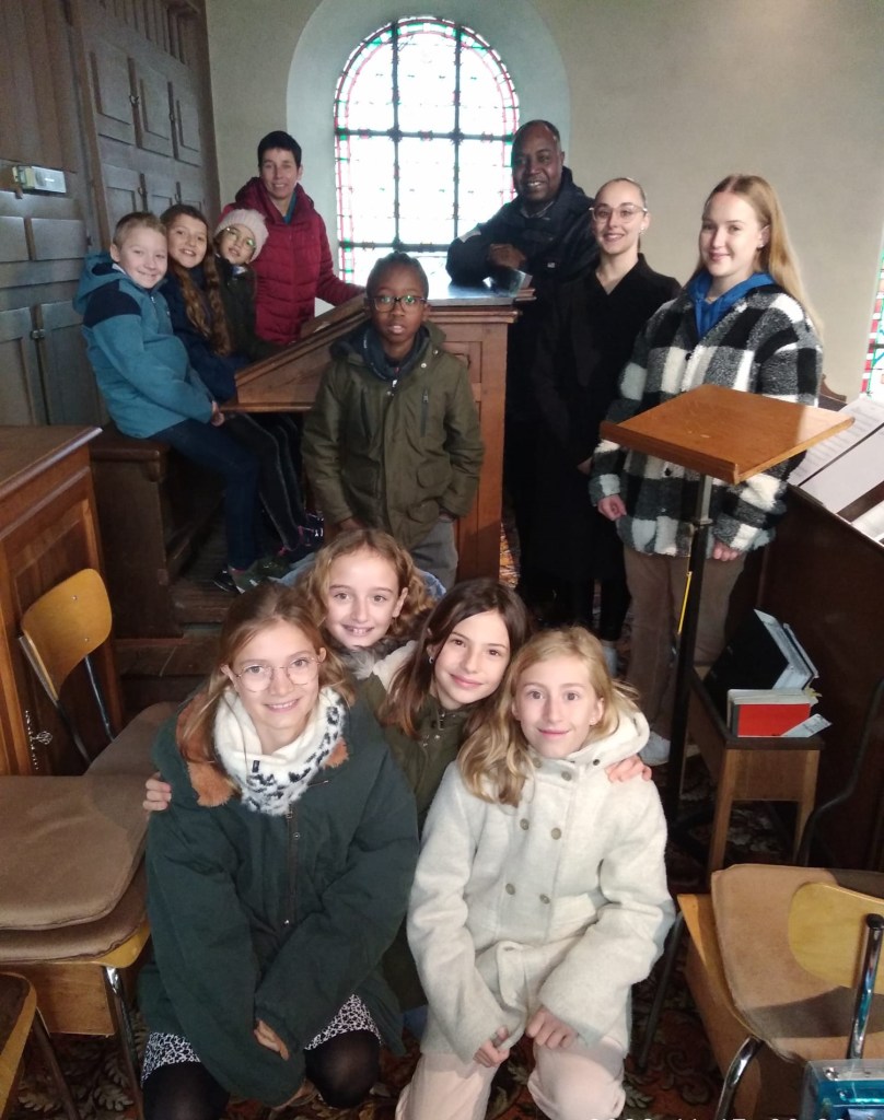 Les enfants du cours de religion catholique accompagnés de Mme Murielle ROBERT, professeur de religion et de 2 stagiaires, ont découvert l’église de Fouches en venant récupérer les dessins réalisés à l’occasion de la St Hubert.
