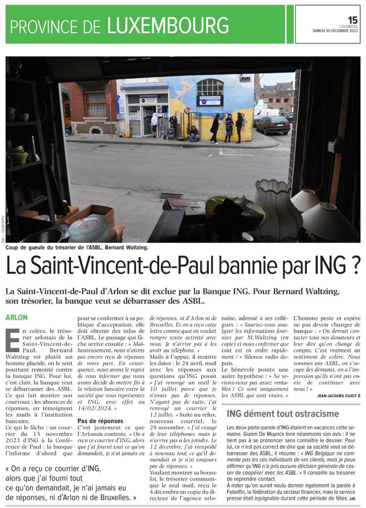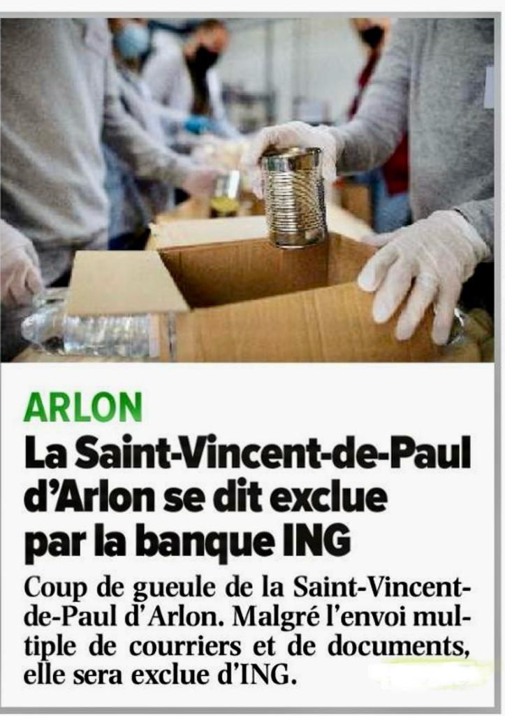 C’est l’émoi dans la communauté de « Saint Vincent de Paul » à Arlon. Depuis des années, les dons (absolument vitaux à la pérennité de l’ASBL) arrivent sur un numéro de compte bien ancré dans les habitudes des généreux donateurs. Soudainement, et ce malgré le respect des procédures réclamées, l’ASBL se voit jetée hors de la banque historique de l’association. Cela va engendrer de multiples complications administratives, là où les énergies devraient être dirigées vers les démunis. Les nombreux bénévoles engagés dans cette belle entreprise de solidarité attendent des explications rationnelles qui justifient un telle sentence unilatérale. J.J. Guiot nous relate les événements dans un article publié dans le journal « L’Avenir » du samedi 30 décembre 2023.