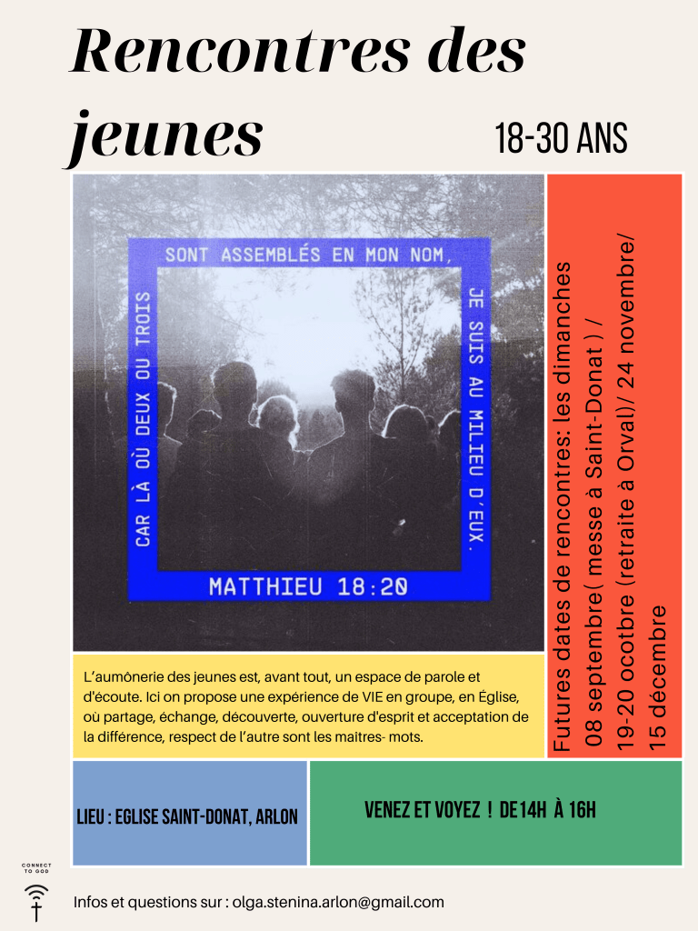 Des rencontres régulières à l’église Saint-Donat à Arlon . La forme et la fréquence des rencontres varient en fonction des lieux : enseignements, échanges autour d’un thème, partage d’un repas, parcours Alpha, ciné-débat, animation de chants.