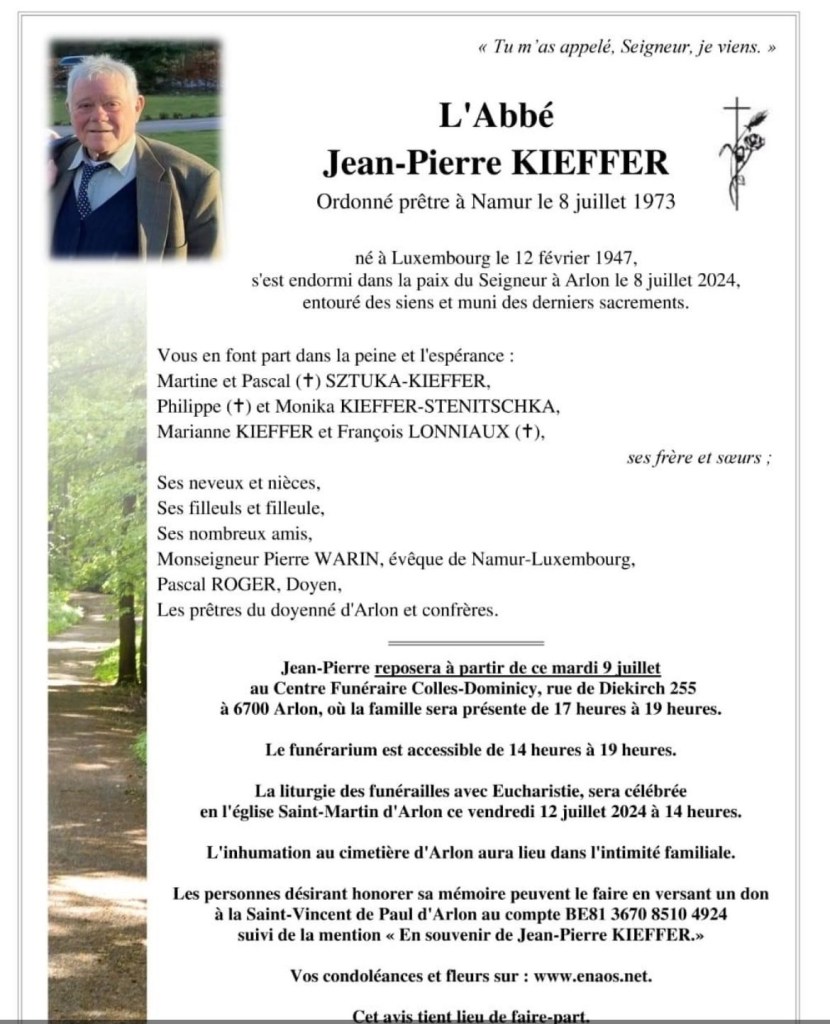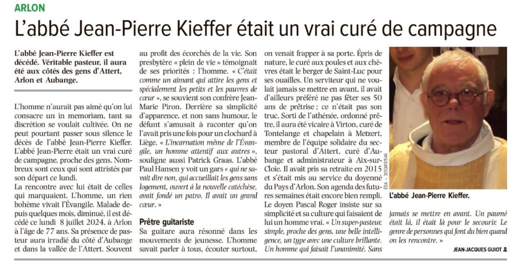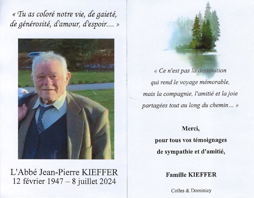 Lors des funérailles de Mr l’abbé Jean-Pierre KIEFFER, c’est à son ami, Mr l’abbé Jean-Marie PIRON, que l’on a confié la mission de faire l’hommage et l’homélie de cet homme… « aimant ».