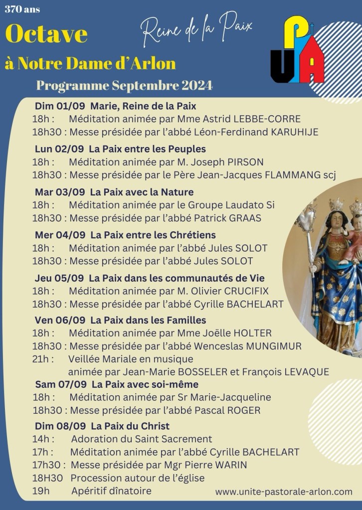 En 2024, l’Octave à Notre-Dame d’Arlon revêt une importance particulière puisqu’il commémore les 370 ans de cette tradition religieuse chère au cœur des Arlonais. Cette année, l’octave se déroulera du 1er au 8 septembre, sous le thème de la paix, une thématique qui résonne particulièrement dans le contexte actuel.