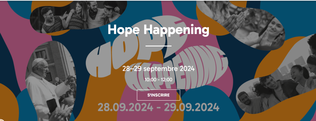 A l’occasion de la visite du Pape – du 26 au 29 septembre 2024 – en Belgique, nous organisons un Hope Happening pour vous à Brussels Expo à Bruxelles ! Tous les jeunes de 12 à 30 ans sont les bienvenus, qu’ils soient croyants, non croyants ou en recherche. Vous êtes les bienvenus du samedi 28 septembre à 10h00 jusqu’à l’Eucharistie avec le Pape le dimanche 29 septembre à 10h00. (Pour les bénévoles et les animateurs, il n’y a pas de limite d’âge).