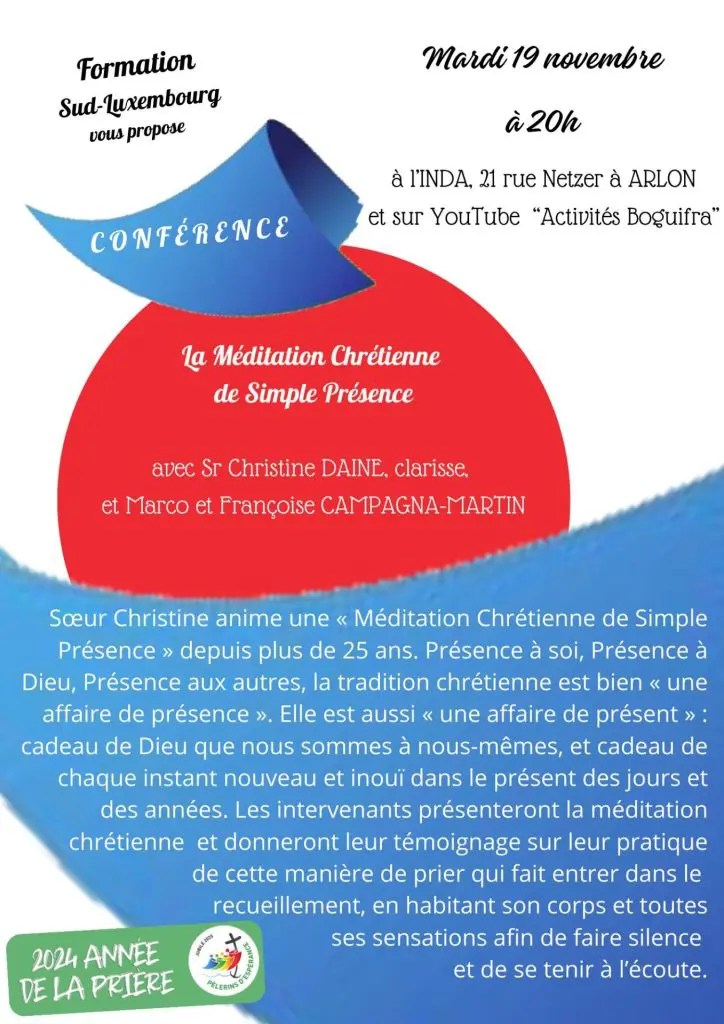 Enfin, l’équipe Formation Sud-Luxembourg propose deux conférences sur la prière à l’INDA, au 21 rue Netzer, à Arlon :
