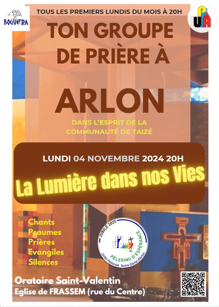 Rejoignez-nous, toujours le lundi 4 novembre à 20h dans l’oratoire Saint-Valentin de Frassem pour une soirée de prière autour du thème de la Lumière ! 🌟 Ce mois-ci, nous nous rassemblons pour réfléchir et prier ensemble autour de la Lumière – celle qui éclaire nos vies et nous aide à traverser les moments d’ombre. Ensemble, laissons l’Esprit-Saint illuminer nos cœurs et remplir nos vies de sa paix et de sa clarté. Venez tels que vous êtes et laissez la Lumière nous rassembler !