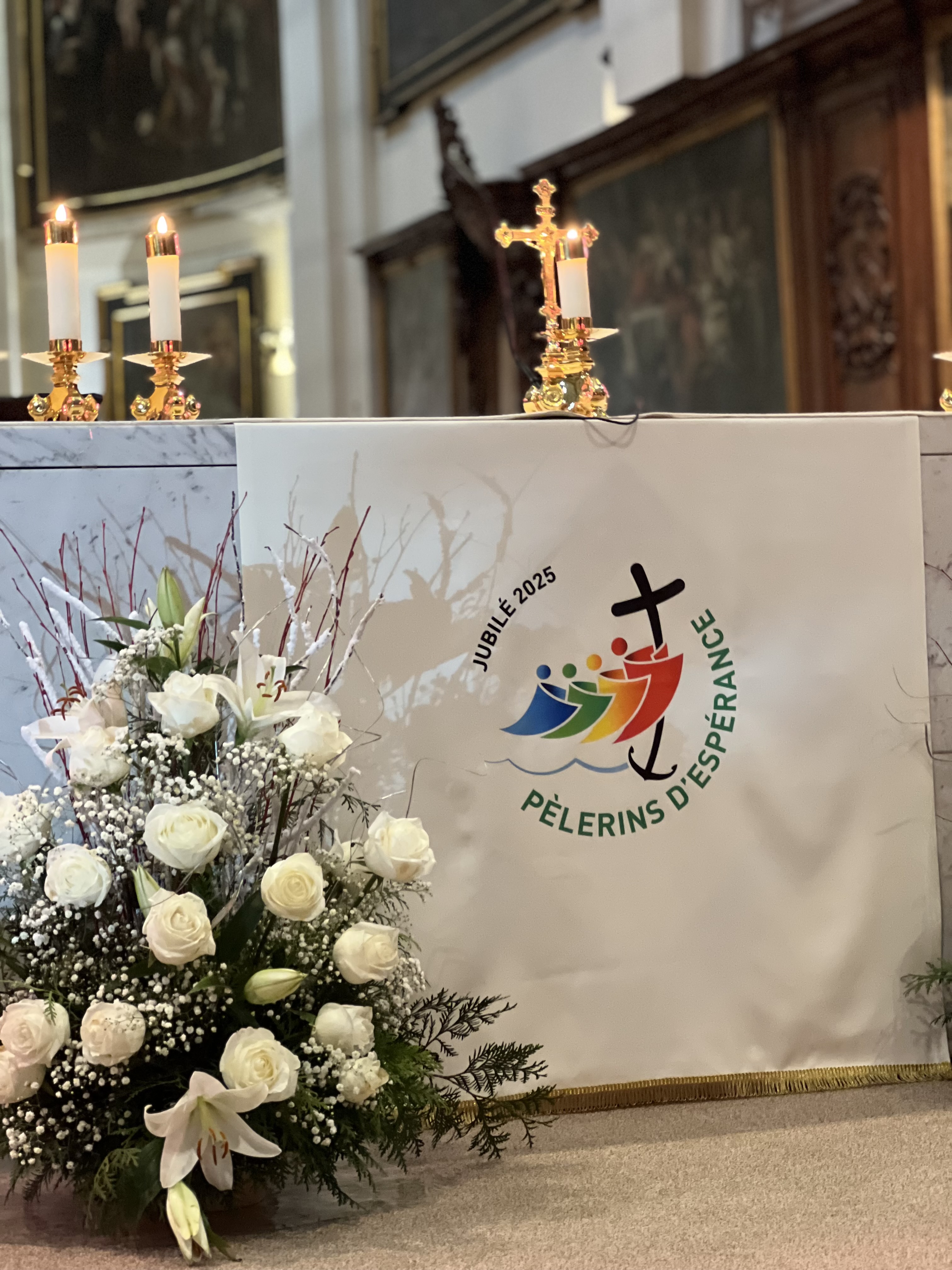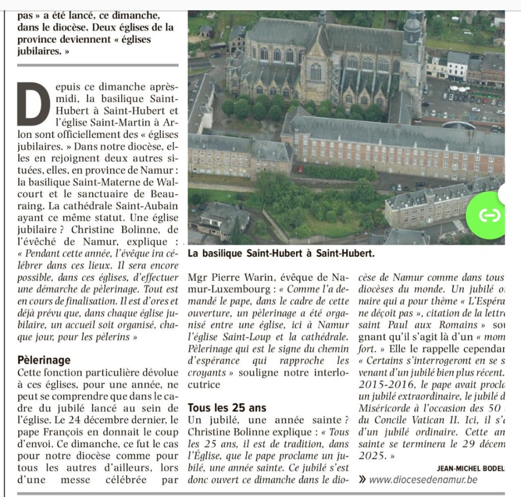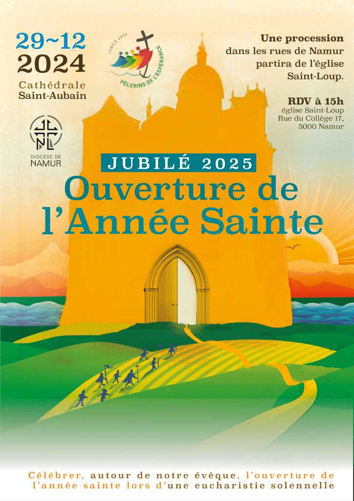 Le coup d’envoi de l’Année Sainte a été donné à Rome le 24 décembre par notre Pape François par l’ouverture toute symbolique de la porte Sainte. Et chez nous, dans le diocèse de Namur-Luxembourg, ce moment a été célébré en grande pompe le dimanche 29 décembre ! Tout a commencé à 14h30, avec le rassemblement des prêtres, diacres et participants dans la cathédrale Saint-Aubain de Namur. Ensuite Direction ensuite l’église Saint-Loup pour le rite d’ouverture officiel. Là-bas, Monseigneur Warin a accueilli chaleureusement les invités de marque, dont le tout nouveau père de l’abbaye de Maredsous à savoir le Père François Lear. La cérémonie a pris son envol avec l’hymne officiel de l’Année Sainte, magnifiquement chanté par la chorale, interprétation que nous entendons en ce moment. Après une exhortation inspirante de notre évêque et la proclamation de l’Évangile, la procession s’est mise en marche, portée par le chant de la supplication litanique. Arrivés à la cathédrale, ce fut l’entrée solennelle; Ensuite l’évêque, Mgr Warin, a procédé au rite de l’aspersion, marquant l’ouverture officielle de l’Année Sainte dans notre diocèse. La messe solennelle a été un grand moment de communion. Certains membres de notre unité pastorale y ont activement participé : lecture d’une intention, présentation des offrandes, et, à la fin, une belle symbolique. L’ancre – signe du jubilé – a été remise officiellement pour l’église Saint-Martin d’Arlon, qui devient l’une des cinq églises jubilaires du diocèse, aux côtés de Walcourt, Namur, Saint-Hubert et Beauraing. La célébration s’est achevée dans une ambiance fraternelle, avec un verre de l’amitié partagé au séminaire de Namur. Un temps fort, une journée inoubliable, et une belle entrée dans l’Année Sainte 2025, placée sous le signe de la foi et de l’espérance ! »