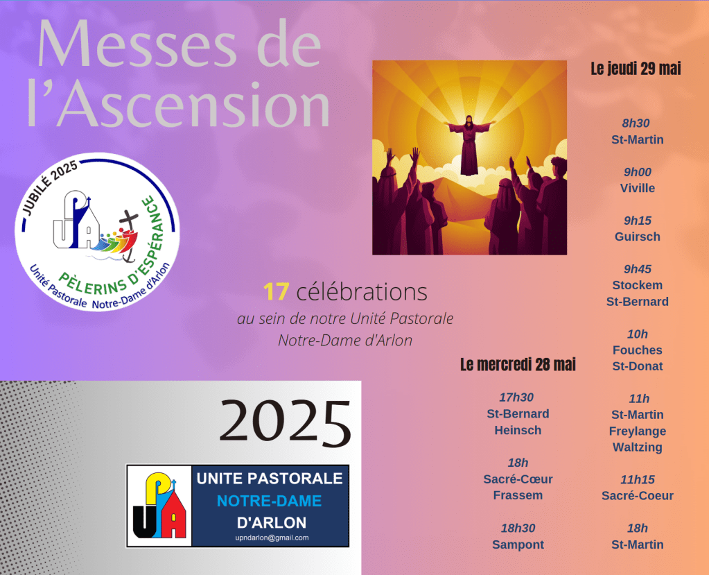 Programme : Ascension 2025 Le 21 Mai 2025 par Boguifra Mediadans Célébrations Partager : Cliquer pour partager sur X(ouvre dans une nouvelle fenêtre) X Cliquez pour partager sur Facebook(ouvre dans une nouvelle fenêtre) Facebook J’aime chargement… Similaire