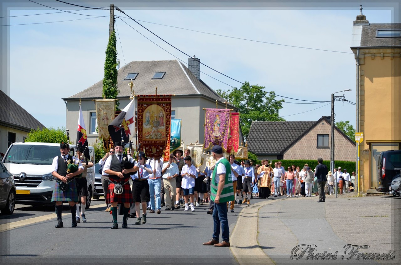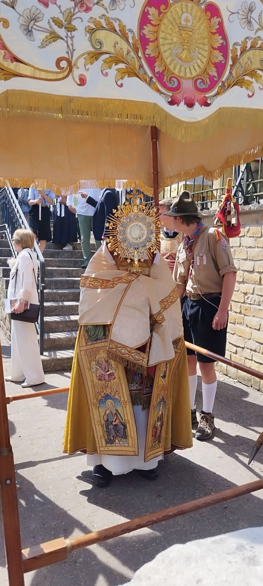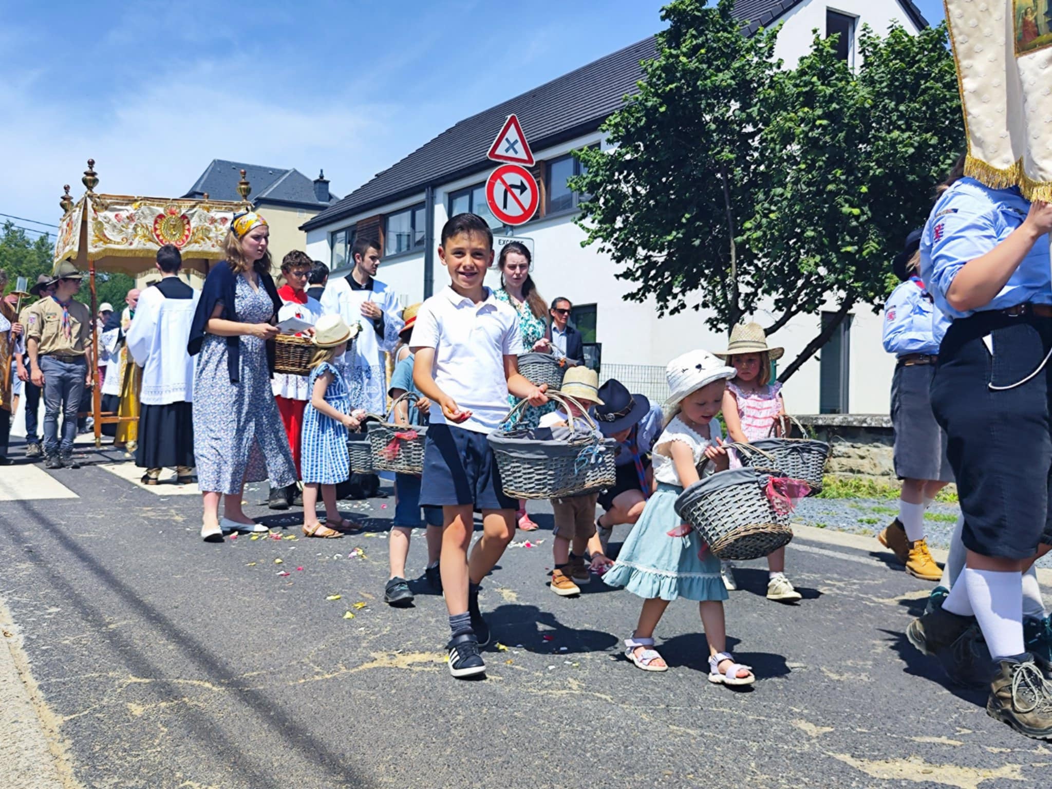 Les guides et les scouts, fidèles au poste, ont apporté leur dynamisme et leur présence joyeuse à la célébration. Après cette messe priante et chantante, la procession eucharistique s’est élancée dans les rues du village, au son des cornemuses qui donnaient à l’ensemble une atmosphère à la fois solennelle et festive.