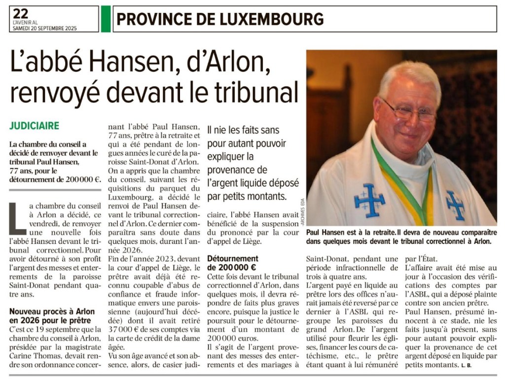 Une enquête a été menée par les autorités compétentes. L’équipe pastorale fait confiance à la justice. Nous rappelons que l’abbé Paul Hansen bénéficie, comme tout citoyen, de la présomption d’innocence et qu’il lui appartient de se défendre.