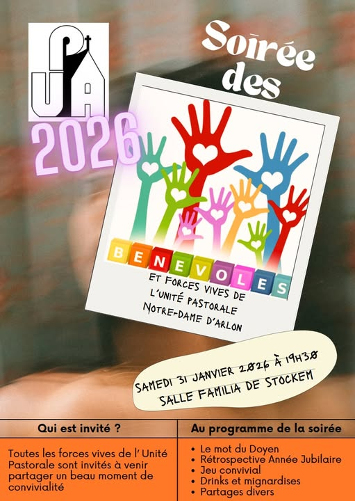 Et justement, pour que nous puissions dire merci à toutes ces belles énergies, à tous ces bénévoles qui, comme ce 17 janvier, donnent de leur temps et de leur cœur, nous vous invitons chaleureusement à la soirée annuelle qui se tiendra à 19h30 ce 31 janvier à la salle « Familia » de Stockem. Ce sera un moment de joie et de gratitude, pour célébrer ensemble ce que nous accomplissons, main dans la main, pour notre unité pastorale.