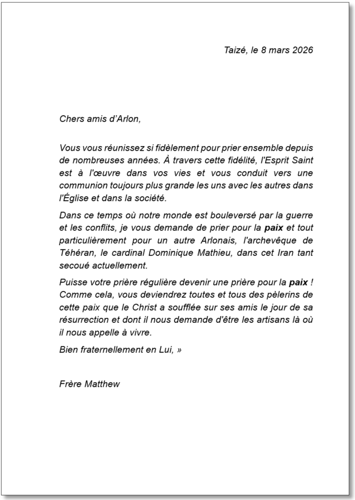 Dans cette lettre, Frère Matthew s’adresse à nous avec simplicité et fraternité pour nous encourager à persévérer dans la prière pour la paix, particulièrement en ces temps où notre monde en a tant besoin. Ses paroles nous rappellent combien la prière, même humble et silencieuse, peut ouvrir des chemins de réconciliation et d’espérance.
