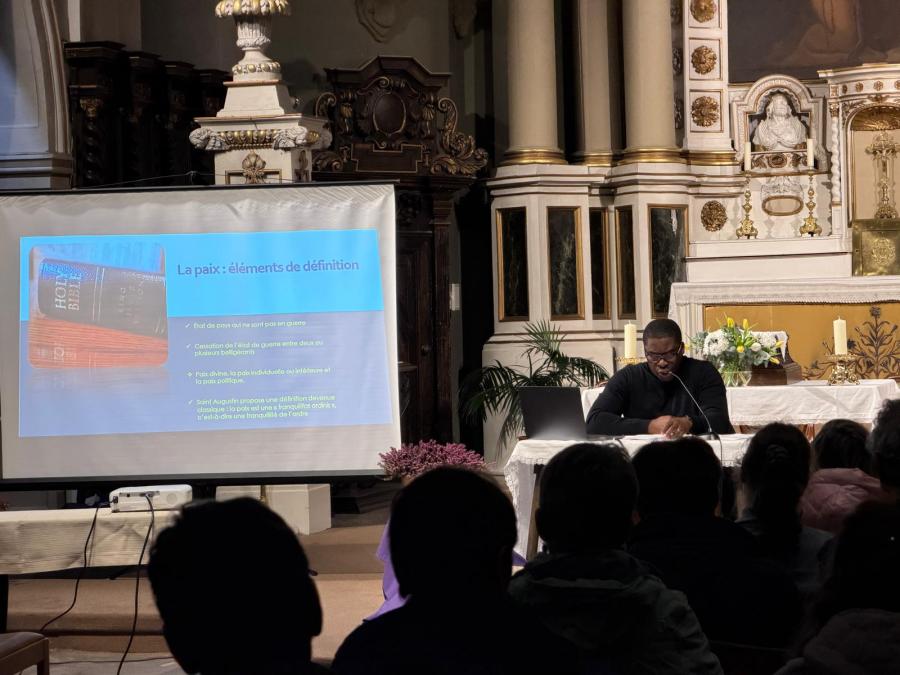 Pour lancer ce temps fort, le père Evens Pierre-Antoine nous a offert une conférence riche et inspirante sur le thème de la paix et de la réconciliation. Un sujet qui résonne particulièrement dans notre monde aujourd’hui, marqué par tant de tensions et de fractures. À l’aide d’un support PowerPoint soigneusement préparé, il a su nous guider avec clarté et profondeur, nous invitant à devenir, chacun à notre place, artisans de paix.