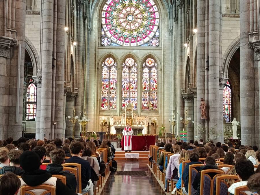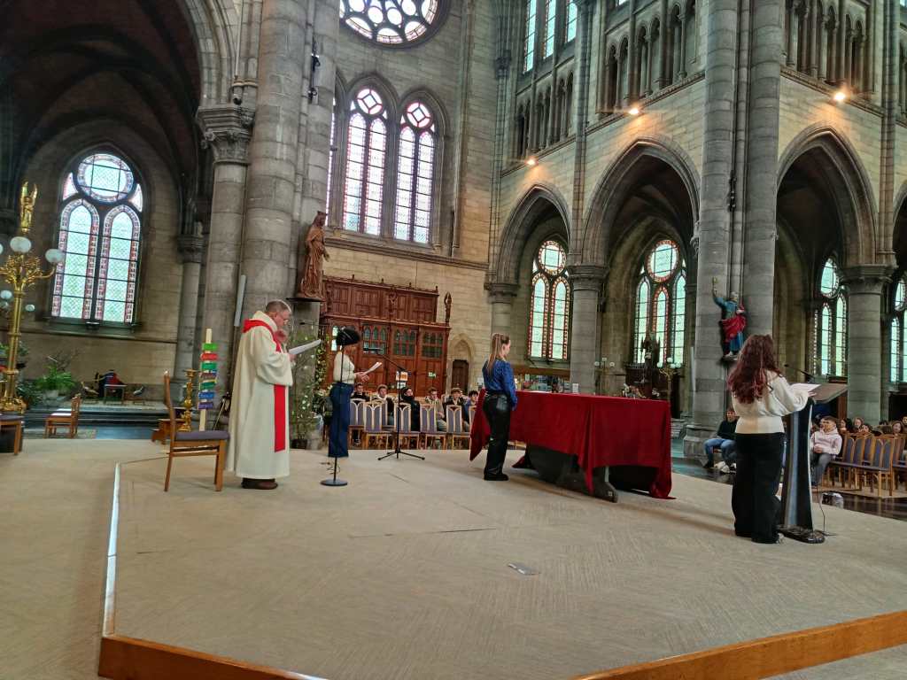 Pour cette célébration, l’équipe pastorale de l’école avait constitué une petite chorale d’élèves, apportant fraîcheur et profondeur à la liturgie. Les chants étaient accompagnés à la guitare par Benoît Hubert, professeur engagé aux côtés des jeunes, ainsi qu’au clavier par une élève de rhéto. Leur participation a donné une tonalité particulièrement priante et habitée à l’ensemble de la célébration.
