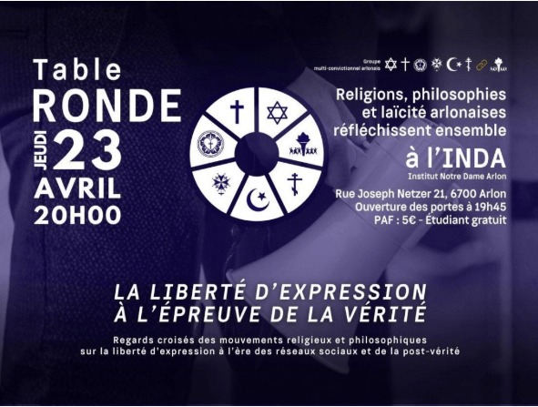 Le groupe multi-convictionnel arlonais organise une Table Ronde le jeudi 23 avril à 20h à l’Institut Notre Dame d’Arlon.
