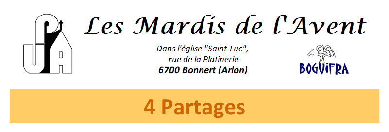 - Les « Mardis de l’Avent ». Pendant la période le l’Avent, tous les mardis à 20h, l’UPNDA (Unité Pastorale Notre-Dame d’Arlon) nous invite à écouter une présentation sur un thème différent chaque année. Il s’en suit un temps de réflexion, de partage en petits groupes.