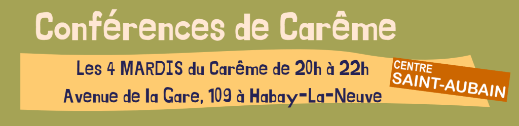 - Les « Mardis du Carême ». Il s’agit d’un cycle de 4 conférences organisées par la RPSL (Région Pastorale du Sud Luxembourg). Elles se tiennent généralement au centre « Saint-Aubain » à Habay-La-Neuve.
