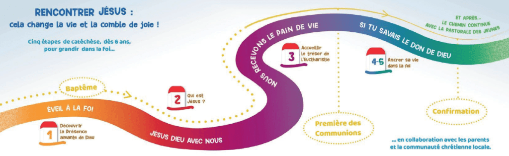 La catéchèse propose un parcours, intitulé Chemins, en cinq étapes qui ouvrent à une vie pleinement chrétienne.