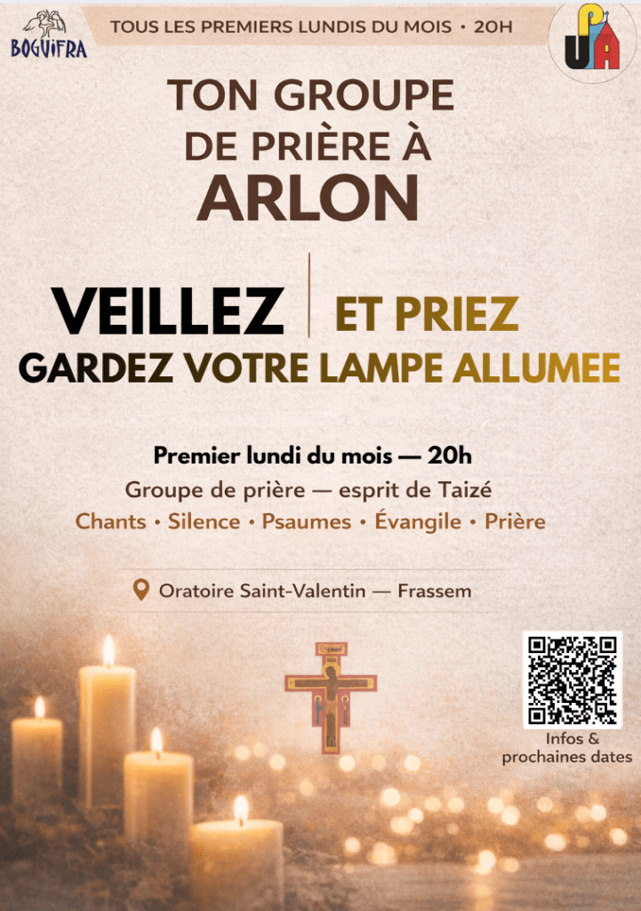 La prière d’ouverture est révélatrice de l’esprit qui préside chaque rencontre : « Seigneur, nous voici réunis pour Te prier, Te rencontrer. Nous quittons le bruit et le manque de recul de notre journée pour prendre un temps, un temps pour Toi, un temps pour faire le vide en nous pour mieux nous remplir de Ta présence, T’écouter, un temps pour Te parler, un temps pour nourrir notre vie de Toi. Nous venons offrir notre fragilité et notre besoin de Toi, sans prétention, en toute humilité. Viens habiter nos longs moments de silence et soutenir nos chants de louanges. Merci de nous accueillir dans ta maison au Nom du Père, du Fils et du Saint-Esprit, amen ». Ainsi, depuis bientôt 20 ans, les prières et les chants de louange de Taizé s’expriment tous les premiers lundis du mois dans l’oratoire Saint-Valentin de Frassem (Arlon) de 20:00 à 21:00.