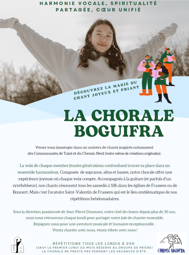 En juin 2004, après de longues réflexions, discernements et autres prières, l’appel de proposer un groupe de prière fut évident et concrétisé le lundi 7 Juin 2004 par une première rencontre à Bonnert. Sous l’inspiration profonde des prières et chants de la communauté œcuménique de Taizé, le groupe de prière BOGUIFRA a rapidement trouvé son cap. Une bonne douzaine de participants peuvent témoigner de cette toute première soirée. L’enthousiasme exprimé par tous témoigne combien ce rendez-vous mensuel a sa place, mais mieux encore, répond une aspiration forte et durable. Une heure simplement ensemble sous le regard et l’écoute du Seigneur.