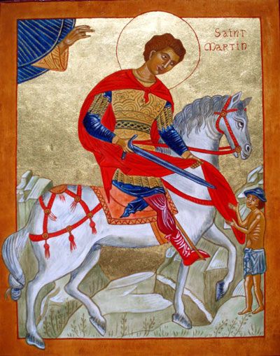 Les Églises d’Orient l’appellent aussi « Saint Martin le Miséricordieux ». Il est né en Pannonie, l’actuelle Hongrie, sur les frontières de l’empire romain où son père était en garnison. A 15 ans, il est soldat car la loi romaine obligeait les fils de soldats à s’enrôler dans l’armée. Il est muté en Gaule et c’est là, qu’à Amiens, il rencontre le pauvre grelottant à qui il donne la moitié de son manteau et dont il apprend durant la nuit que c’est le Christ qui lui a fait cette demande. Il hésitait à devenir chrétien, il s’y décide enfin. Il quitte l’armée pour rejoindre Saint Hilaire à Poitiers. Avec lui, il fonde le premier monastère des Gaules, à Ligugé, en Poitou. C’est là qu’il sera enlevé par les habitants de Tours qui en font leur évêque. Mais l’ancien soldat devenu chrétien ne s’enfermera pas dans sa cité. Il évangélisera parcourant les campagnes jusqu’à sa mort, à Candes, sur les bords de Loire, disant: « Seigneur, s’il le faut, garde-moi en vie, car je ne refuse pas le labeur. »
