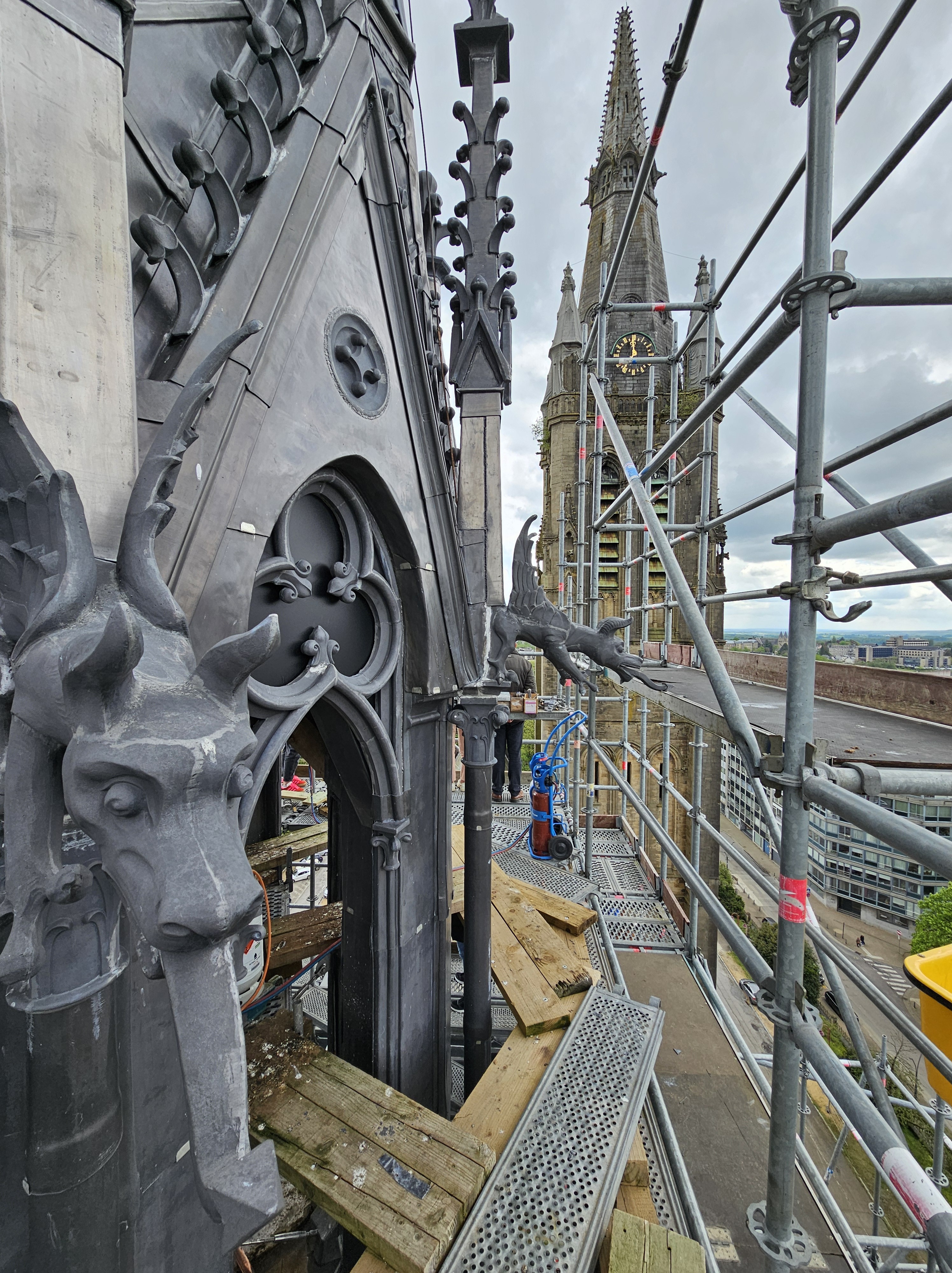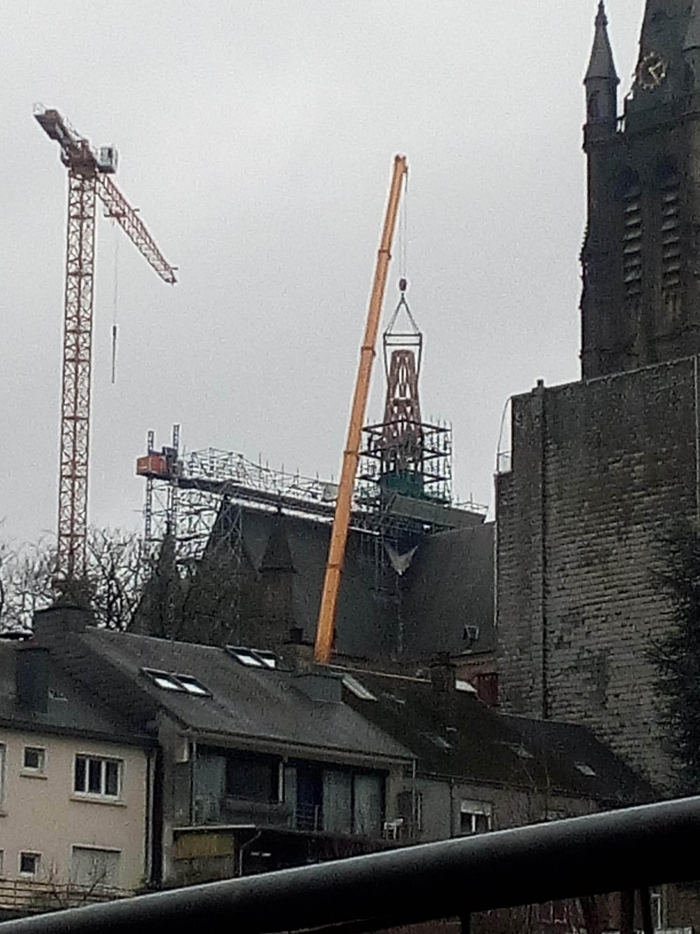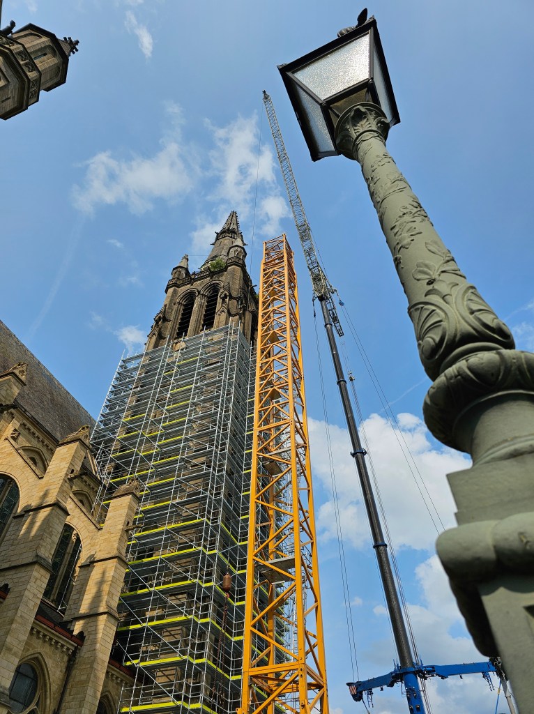 Vous avez certainement remarqué que les travaux relatifs à la Tour clocher ont démarré à St Martin. Nous sommes partis pour 4 ans de travaux. Dans l’immédiat, pose du socle pour la grue qui accompagnera l’ensemble de ces travaux et dressage de l’échafaudage jusqu’au sommet de la Tour (2 mois de travail). L’installation de la grue a nécessité le démontage partiel du mur de clôture de l’église et le coulage d’une dalle de béton pour en assurer la parfaite stabilité. En août, dépose de la flèche de la Tour (jusqu’en dessous de l’horloge), la Tour sera ainsi « décapitée » pendant un an environ, le temps de démolir le plancher en béton des cloches (la cause des fissures apparues dans la Tour, le béton, contrairement au bois, n’a pas absorbé les contraintes liées au mouvement de balancier des cloches), de la réfection des pierres de cette partie haute, de la rénovation des horloges et de la reconstruction d’un nouveau plancher. Cette flèche sera remontée à sa place courant du second semestre 2026, avec sa croix sommitale qui avait été enlevée précipitamment il y a une paire d’années lorsqu’une tempête l’avait fait vaciller avec le risque qu’elle ne tombe et abîme d’autres parties de la Tour. 2027 et 2028 verront la restauration de la partie haute du fût (partie haute sous la flèche), ainsi que des menuiseries et des vitraux liés à cette partie…